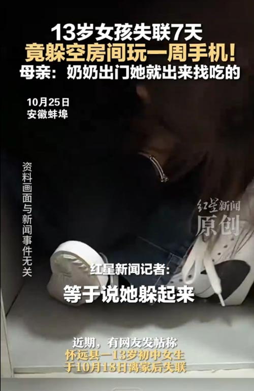 10月25日,记者联系上女孩母亲杨女士,其表示女孩刚刚被找到,竟然一直躲在奶奶家的空房间里玩手机。