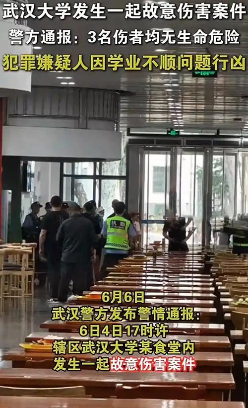 6月6日,武汉市公安局洪山区分局通报,6月4日17时许,辖区武汉大学某食堂内发生一起故意伤害案件。民警迅速赶赴现场处置,会同学校、120急救等部门将3名伤者及时送医治疗。目前,伤者均无生命危险。犯罪嫌疑人朱某(男,23岁,该校学生)被警方当场控制。经审查,朱某因学业不顺问题行凶,其对犯罪事实供认不讳,已被采取刑事强制措施。案件正在进一步侦办中。
