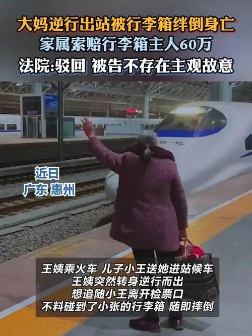 原标题:大妈火车站逆行被行李箱绊倒后身亡,家属索赔60万被法院驳回