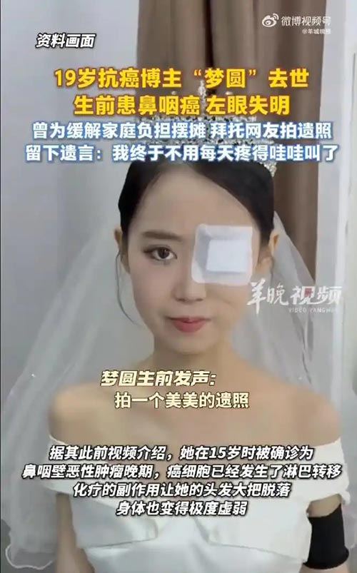 近日,博主“梁文泊”发视频称,山东19岁抗癌女孩“梦圆”于8月14日早上8时04分因鼻咽癌晚期不幸离世。她在15岁时被确诊癌症晚期,此后抗癌五年,因病其中一只眼睛已失明。因为妈妈有智力障碍曾被同学嘲笑,觉得拖累家人,为减轻家中负担曾拖延治疗,外出摆摊。她在病痛中坚强生活。梦圆在离世前穿了婚纱拍了遗照。
