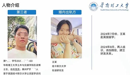 2024年8月,王某在英国纽卡斯尔大学大学认识了29岁的黄某某,黄某某是华南理工大学在读博士生,中共党员,在国家留学基金管理委员会和华南理工大学的支持下到纽卡斯尔大学做访问学者。黄某某在明知道王某已婚且生育过一孩的情况下,执意追求王某。