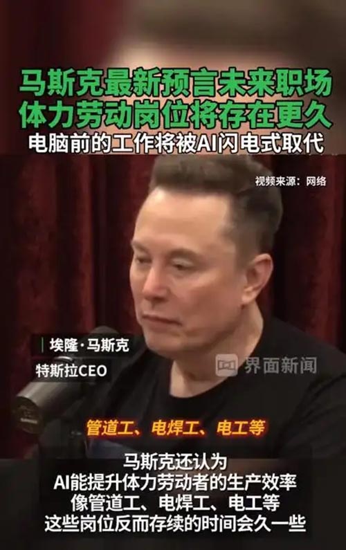 最近,马斯克接受一场3小时访谈。访谈中,他对未来职业进行了预测——所有在电脑前处理的工作很快会被AI取代,但体力劳动难被AI取代,“这些工作会存在得更久”。