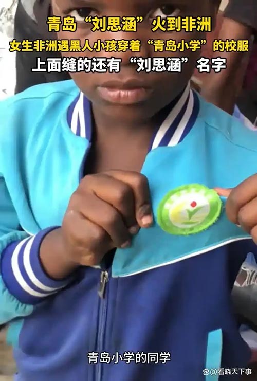 “青岛小学的刘思涵火了!”非洲安哥拉,一位博主在一个华人商贸城里,突然看到一名非洲小孩穿的衣服有中文字样,就上前询问查看,结果却发现还真是一所小学的校服,甚至小孩还知道,校服上面缝了一个名字