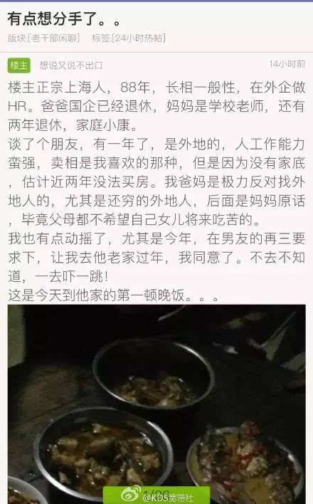 @何磊:我想说农村长大的都知道这些饭菜看起来都是这样的,也许看起来黑,但是我想说不是农村人不要随便就说脏!那些碗筷不脏,我现在也还是年年吃这样的。看不起穷人没关系,人家也没指望你什么。事件中的女的就是没教养,说难听是没家教,上海人的自大是全国闻名的!这对情侣分了也是对的,我只想说事中的男主角眼光才是差!这种女的我一开始就不会要!