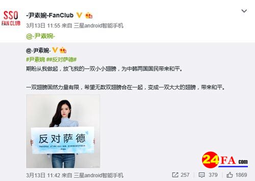 3月13日,韩国女主播尹素婉发微博表立场:“反对萨德”,期盼为中韩两国国民带来和平。尹素婉原是韩国直播平台Afreeca TV的当家主播,以性感的身材与热舞在中韩两国都有不少粉丝。王思聪曾用2000万的薪酬将她挖走。但尹素婉还是结束了她在熊猫TV的最后一场直播在去年12月初,并在微博上向网友们告别,随后重回老东家。
