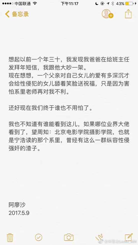 林奕含自杀事件闹得沸沸扬扬,今天凌晨两点58分,微博实名认证为“畅毅文化艺人事业部总经理”的@宋泽尘Leslie_AM 发表微博,称好友“阿廖沙”在北京电影学院就读期间,遭遇班主任的父亲性侵,事后阿廖沙更遭遇来自老师和同学的排挤和歧视。截图直接爆班主任朱炯的父亲朱正明对她性侵,报警也没用,而且北京电影学院电影学院这种人渣还有很多…北京电影学院作为一个电影人的高等学府,校训“尊师重道,薪火相传”居然能发生这种事……希望这件事情能被关注!