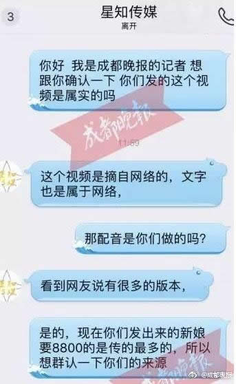 成都晚报记者对话到了“星知传媒”工作人员,求证内容是否属实,该工作人员明确回应记者,这个视频是摘自网络的,文字也是来源网络,“配音是由我们做的,内容是通过大的新闻门户网站来摘录。”不过,该工作人员并未明确回应,文字内容到底从何而来。