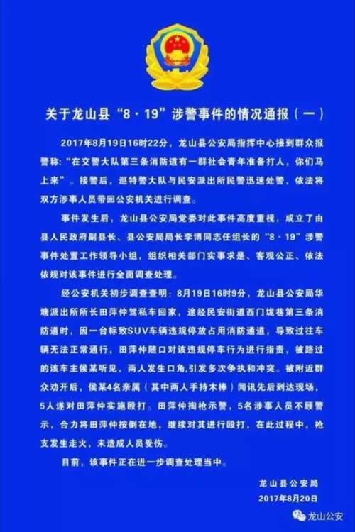 经公安机关初步调查查明:8月19日16时9分,龙山县公安局华塘派出所所长田萍仲驾私车回家,途经民安街道西门垅巷第三条消防通道时,因一台标致SUV车辆违规停放占用消防通道,导致过往车辆无法通行,田萍仲随口对该违规停车行为进行指责,被路过的该车主侯某听见,两人发生口角,引发多次争执和冲突。被附近群众劝开后,侯某4名亲属(其中两人手持木棒)闻讯先后赶到现场,5人遂对田萍仲实施殴打。田萍仲鸣枪示警,5名涉事人员不顾警示,合力将田萍仲按倒在地,继续对其进行殴打殴打,在此过程中,枪支发生走火,未造成人员受伤。
