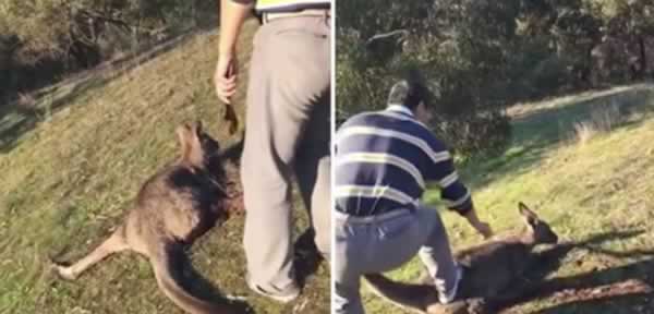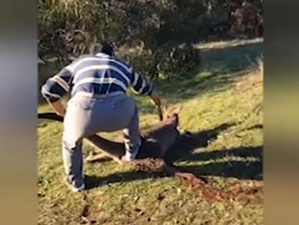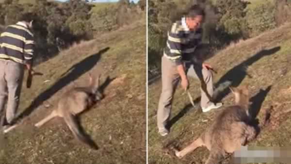 该男子的朋友拍下他抓住袋鼠的尾巴,用腿紧紧压住袋鼠,无视袋鼠的悲鸣,开始对着袋鼠的脖子一刀刀割着。在1分41秒的视频中,该男子总共割了19刀!