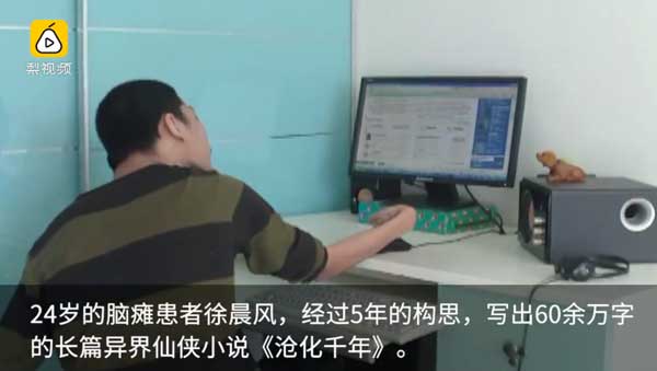 黑龙江大庆,24岁的徐晨风从小就是重度脑瘫患者,生活不能自理。但他自学写作,经5年构思,用胳膊肘在键盘上敲写出长篇小说,现已完成60余万字。