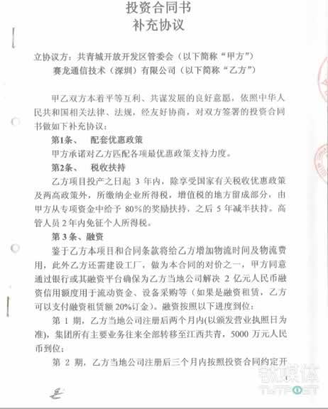 赛龙与共青城政府签订的投资协议。其中第二条税收扶持中,关于高管免税的记录。