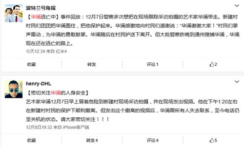 12月8日,据微博网友 @波特兰号角报 消息:【华涌逃亡中】事件回放:12月7日警察多次想把在现场跟踪采访拍摄的艺术家华涌带走。新建村村民们团团把华涌围住,把他保护起来。华涌感激地向村民们道谢说:“华涌谢谢大家!”村民们掌声雷动,为华涌的勇敢鼓掌。华涌随后在村民护送下离开。但大批警察昨晚到通州搜捕华涌,华涌现在还在逃亡的路上。