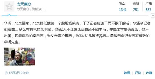 另据腾讯网友·@力天度心 12月3日消息称:华涌,北京画家,北京排低端第一个跑现场采访,干了记者应该干而不敢干的活,华涌令记者们羞愧… 多么有骨气的艺术家,他说:人不让说话活着还不如牛马,宁愿坐牢要说真话,他不出国,现无底价拍卖自画,为父亲弄护理费,为3岁幼儿筹抚养费… 勇敢善良记者画家尊敬的华涌先生。