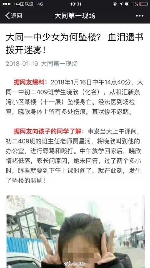 2018年1月16日中午14点40分,大同一中初二409班学生晓欣(化名),从和汇新泉湾小区某楼(十一层)坠楼身亡。经法医到场检查,晓欣身体上留有多处伤痕,其状惨不忍睹。