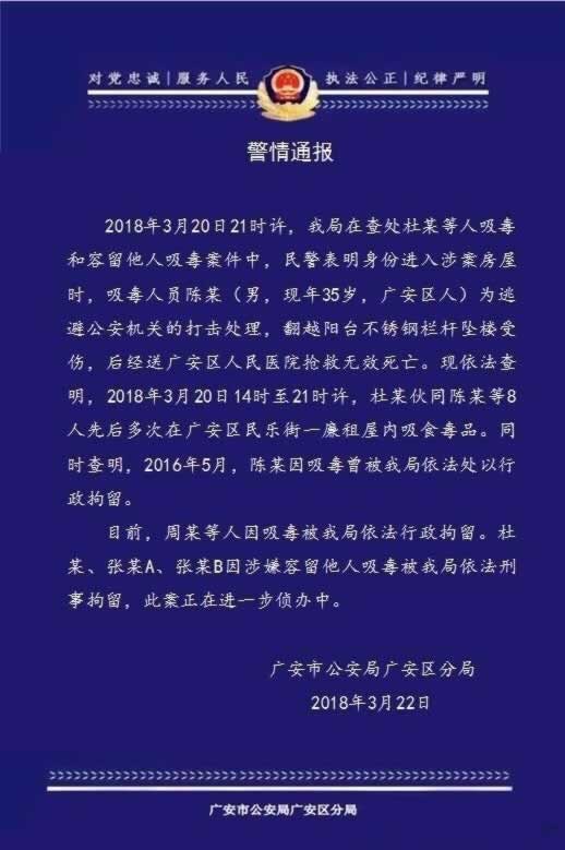 (副标题:广安一吸毒人员为逃避警方检查坠楼身亡)