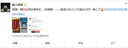 据网友曝料:海航一名空姐,和同机的已婚副驾驶搞婚外情,还想藉怀孕逼退原配扶正。原配雇用工读生在海航总部大楼、小三家门口高举“感谢海航XXX为我老公提供生理服务”的锦旗。原配甚至亲自登机赠送锦旗,且和颜悦色地要其他空姐多多照顾“老公的洩欲工具“。吓得小三躲进厕所迟迟不敢出来。上梁不正下梁歪啊。