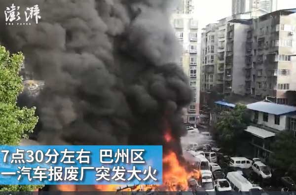 实拍四川巴中汽车报废厂突发火灾伴爆炸声现场视频