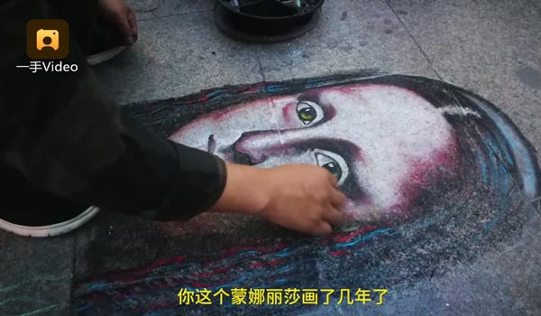 6月4日,杭州某地铁站口,有一位街头画家,在地上画画。他用粉笔画蒙娜丽莎,称画了有两三年了,因为乙肝大三阳不好找工作。一幅要画六七个小时。