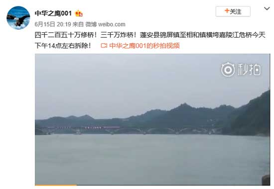据网友@中华之鹰001曝料称:四千二百五十万修桥!三千万炸桥!蓬安县锦屏镇至相和镇横垮嘉陵江危桥今天下午14点左右拆除!