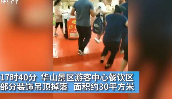 6月16日,陕西华山景区游客中心部分装饰吊顶掉落砸中游客,9人受伤。一游客告诉澎湃新闻,撤离时上方掉落碎渣不敢睁眼。景区工作人员称,涉事天花板可能存在问题。