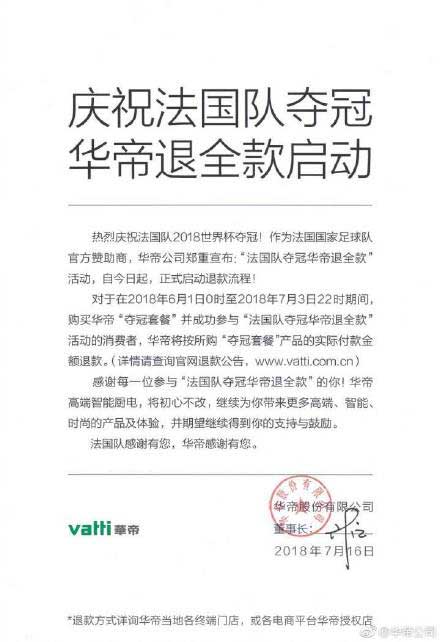 7月16日凌晨,华帝股份有限公司(华帝股份,002035)官方微信服务号宣布,正如之前承诺:法国队夺冠,华帝退全款。华帝 “退全款” 现已正式启动!