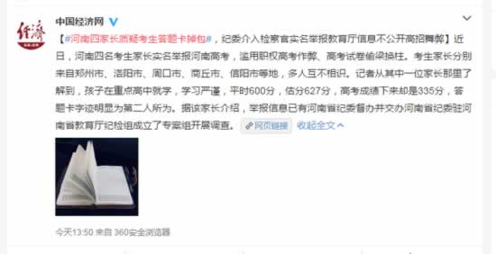 其中声称有4名来自郑州、洛阳、周口等城市的家长表示,4家孩子今年的高考分数与以往成绩、高考后估分严重不符;他们怀疑孩子的答题卡被人调了包,并向纪检监察部门实名举报河南省高考招生办公室相关负责人“滥用职权、组织考试作弊、内外勾结”。