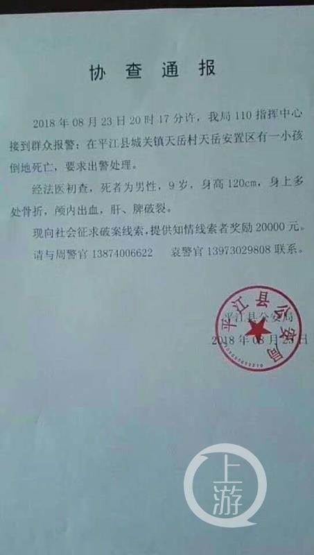8月25日,平江县发布协查通报称,8月23日晚8时17分,接到群众报警称,平江县城关镇天岳村天岳安置区有一小孩倒地死亡。