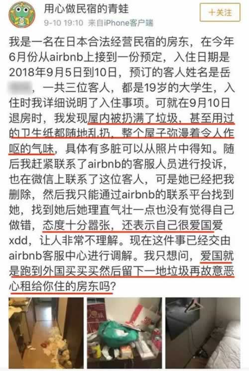 9月10日,一名在日本大阪开民宿的中国老板发文称,3名来自中国的女大学生通过短租平台爱彼迎入住他家民宿,然而到了退房的日期,老板到了民宿后却被眼前景象惊呆了。