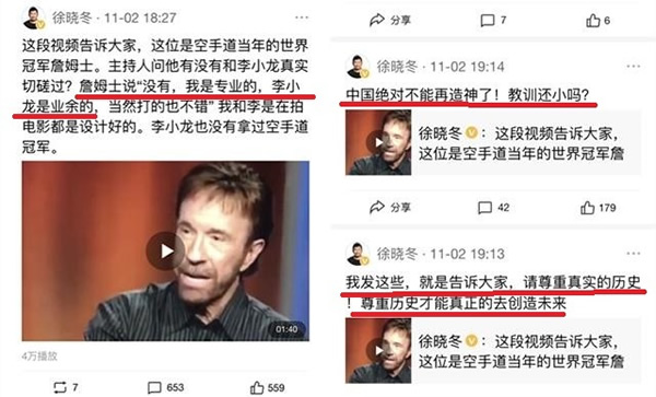 近日,格徐晓冬为了再次证明自己的言论,甚至找到了证据。是当初国外空手道世界冠军詹姆士接受采访的视频,视频中詹姆士被记者问到:“有没有和李小龙真实切磋过?”根据徐晓冬的翻译,詹姆士说:“没有,我是专业的,李小龙是业余的,当然打的也不错,我和李在拍电影时都是设计好的“徐晓冬发布这个视频再次强调:“中国绝对不能再造神了,教训还不小嘛?我发这些就是告诉大家,轻尊重真实的历史,尊重历史才能真正的去创造未来”。