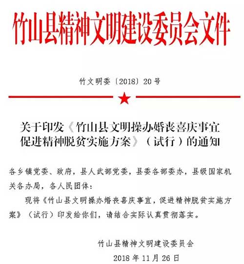 婚丧喜庆宴请宾客是中华民族的传统习俗,但一段时间以来,滋生了讲排场、比阔气的不良风气,良好的传统演变为大操大办、奢侈浪费的“面子工程”。为进一步推动党风政风和社风民风持续向善向上,助推精神脱贫和乡村振兴战略,十堰市竹山县特制定《竹山县文明操办婚丧喜庆事宜促进精神脱贫实施方案(试行)》。