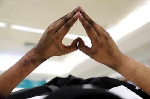如今,张文政每天的治疗费用少则两万,多则四五万,治疗费用压得全家都喘不过来气,可如果停止治疗,后果将不堪设想。目前,一家依然在坚持,爸爸张合理又回家开始筹钱。“只要还有一丝希望,我们就不会放弃。”谢艳玲坚定地说。图为进入检查室前,文政用双手比出心形手势。