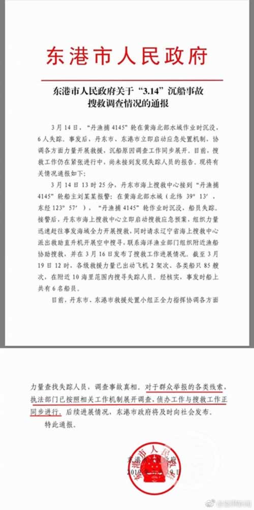 3月14日,辽宁省东港市发生一起丹渔捕4145号沉船事故,致万兆明、李树斌、吴世财、于东升、邹德有、朱宝旬等6名船员失踪。事发至今已12天,失踪人员尚未找到。