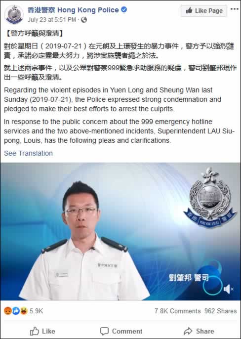 23日,香港警方在其官方脸书上对21日当天999电话被打爆的情况进行了说明,并重申了警方对元朗及上环暴力事件的强烈谴责。