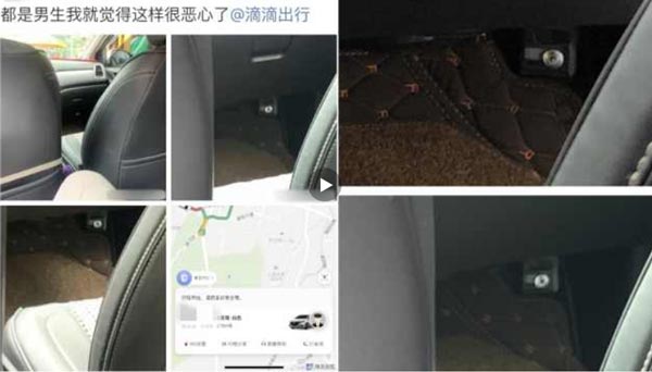 2019年9月20日,贵州贵阳的郭先生在微博上称,自己乘坐滴滴车时发现车上的副驾驶座前,有偷拍的摄像头。@ 滴滴出行 在微博联系上郭先生,称将调查此事。后拍客联系上当事司机文师傅,他称那只是一颗螺丝钉。