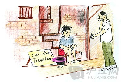 一个双目失明的男孩坐在大楼前的台阶上,脚边摆着一顶帽子。他立了一块牌子,上面写着:“我是瞎子,请帮助我。”那帽子里只有寥寥几枚硬币。