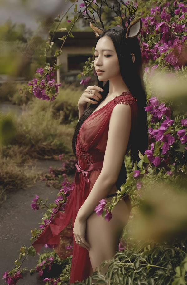 鹿角女孩夏暮光红纱透视长裙唯美无圣光图集