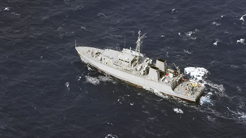 当地时间2023年4月8日,日本冲绳县宫古市,日本海上自卫队“石岛”号扫雷舰在冲绳县宫古市附近搜寻失踪的日本陆上自卫队UH60直升机。人民视觉 图